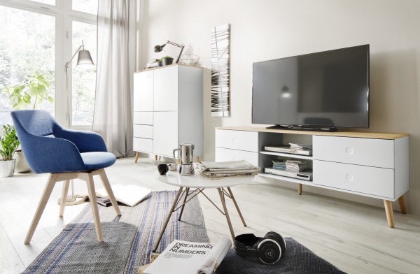 Nádherný a stylový TV stolek DOT od švédského výrobce unikátního nábytku TENZO. Tento TV stolek je vyroben v kombinaci masivního dubového dřeva nohou, dubové dýhy vrchní desky a bíle lakovaných dřevovláknitých mdf desek. Stolek má 2 řady úložných prostorů, levá a pravá část mají 4 dopředu výsuvné zásuvky. Prostřední část pak tvoří 2 otevřené police. Všechny 4 dvířka mají prolisovanou krásnou tečku na svém středu, což z tv stolku dělá krásný unikát