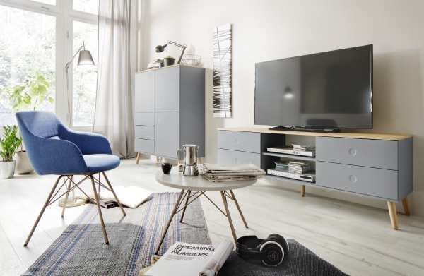 Nádherný a stylový TV stolek DOT od švédského výrobce unikátního nábytku TENZO. Tento TV stolek je vyroben v kombinaci masivního dubového dřeva nohou, dubové dýhy vrchní desky a šedě lakovaných dřevovláknitých mdf desek. Stolek má 2 řady úložných prostorů, levá a pravá část mají 4 dopředu výsuvné zásuvky. Prostřední část pak tvoří 2 otevřené police. Všechny 4 dvířka mají prolisovanou krásnou tečku na svém středu, což z tv stolku dělá krásný unikát.