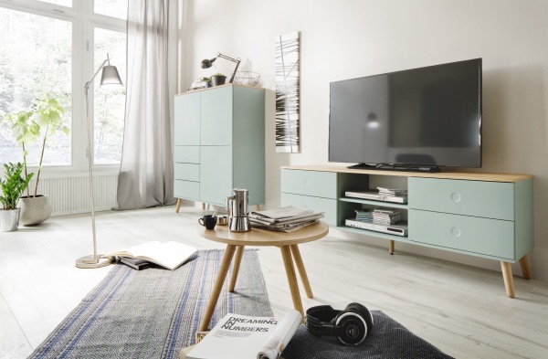 Nádherný a stylový TV stolek DOT od švédského výrobce unikátního nábytku TENZO. Tento TV stolek je vyroben v kombinaci masivního dubového dřeva nohou, dubové dýhy vrchní desky a lakovaných dřevovláknitých mdf desek ve světle zelené barvě. Stolek má 2 řady úložných prostorů, levá a pravá část mají 4 dopředu výsuvné zásuvky. Prostřední část pak tvoří 2 otevřené police. Všechny 4 dvířka mají prolisovanou krásnou tečku na svém středu, což z tv stolku dělá krásný unikát.